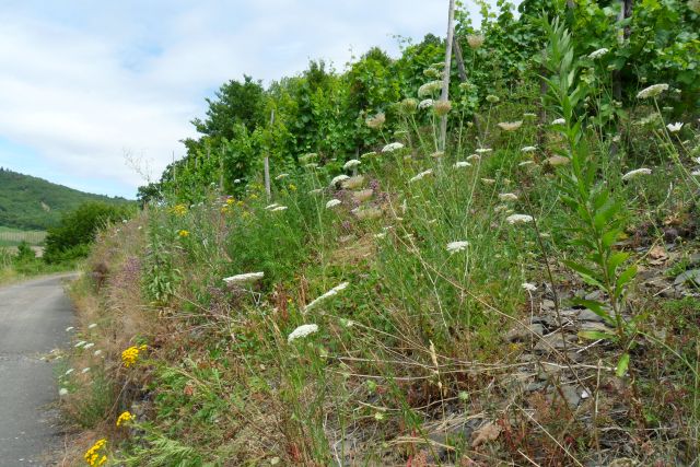 Schon immer war es mir wichtig in meinen Weinbergen neben und unter den Reben auch eine bunte Pflanzen- und Insektenvielfalt zu fördern. Es ist so schön, bei der Arbeit nebenbei auch mal zu beobachten wieviel Leben sich beispielsweise auf einer einzelnen Blütendolde der "Wilden Möhre" tummelt oder von Schmetterlingen wie dem Segelfalter oder dem Schwalbenschwanz umtanzt zu werden. Daher war es für mich selbstverständlich aktiv im Moselprojekt -Steillagenweinbau schafft Vielfalt-, dem regionalen Teil des Bundesprojektes "Lebendige Agrarlandschafte" mit zu arbeiten. Hierbei geht es darum Weinbau und Naturschutz in Einklang zu bringen und heimische Flora und Fauna in der Weinbaukulturlandschaft zu förden. Die gleiche Zielsetzung verfolgt auch die Initiative "Lebendige Moselweinberge", auch hier bin ich aktiv dabei und habe in diesem Rahmen auch in einer 80stündigen Fortbildung die Weiterbildung zur "NaturErlebnisBegleiterin" absolviert. Beide Initiativen wurden als Projekte der "UN-Dekade Biologische Vielfalt" ausgezeichnet. Weitere Informationen hierzu unter www.lebendige-agrarlandschaften.de und unter www.lebendige-moselweinberge.de .
